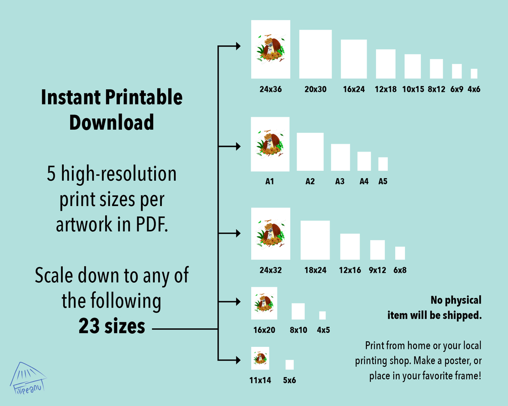 DOWNLOAD INCLUDES 5 large high-resolution print sizes in PDF. You can then scale these down to any of the following 23 sizes: