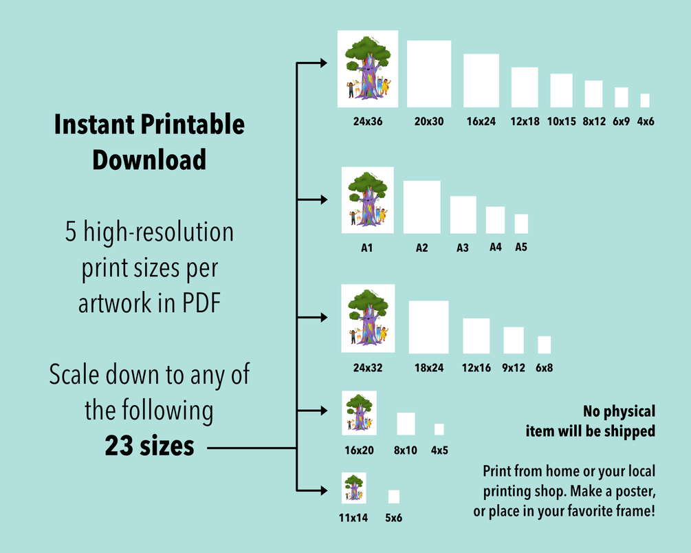 DOWNLOAD INCLUDES 5 large high-resolution print sizes in PDF. You can then scale these down to any of the following 23 sizes: